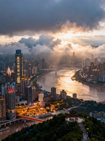 上海陆家嘴金融中心的航拍全景,标志性建筑包括东方明珠电视塔、上海环球金融中心和上海中心大厦,摩天大楼群在日落时分被温暖的橙粉色霞光与深蓝渐变的天空笼罩,云层呈现出丰富的层次感和流动感,黄浦江蜿蜒穿过城市,水面倒映着建筑的璀璨灯光和天空的绚丽色彩,城市灯光已部分亮起,形成温暖的金色与冷调的蓝色交织的光影效果,整体呈现出现代、繁华且极具视觉冲击力的都市夜景氛围,采用写实主义摄影风格,高清晰度,广角视野,色彩饱满,光影对比强烈,强调城市天际线的宏伟与江水的灵动。