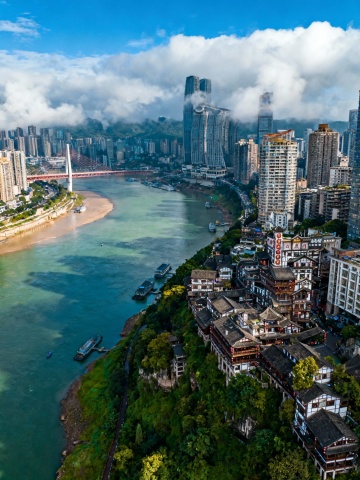 上海陆家嘴金融中心的航拍全景,标志性建筑群包括东方明珠电视塔、上海中心大厦、环球金融中心和金茂大厦,建筑群在日落时分被温暖的橙粉色霞光与深蓝渐变的天空映照,建筑物玻璃幕墙反射着天空的色彩,黄浦江蜿蜒流过城市,水面上有船只驶过留下的波纹和灯光倒影,岸边的道路和建筑灯光已点亮,形成璀璨的城市夜景与黄昏天空的过渡效果,整体呈现出现代、繁华、大气的都市氛围,画面构图采用广阔的远景视角,展现城市的宏伟规模和天际线轮廓,色彩以蓝色、紫色、橙色为主色调,光影对比鲜明,细节丰富,具有高度写实的摄影质感和高清画质。