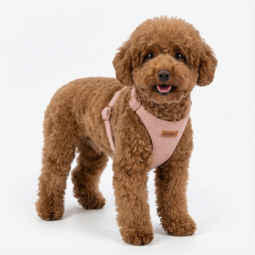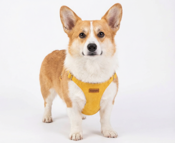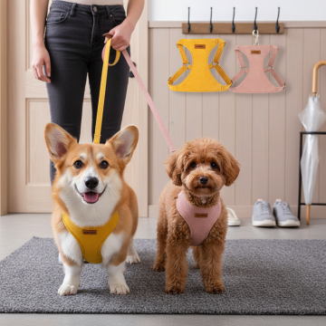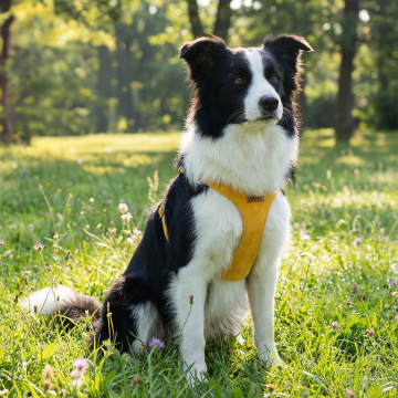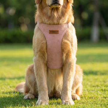 方案一:户外穿戴款:金毛犬穿戴黄色背心式牵引绳站在草坪上,主人轻拉牵引绳,狗狗吐舌微笑,背景虚化突出背心质感