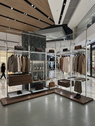 在现代简约风格的高端服装店入口处,一个具有创意几何形状(如流线型弧形、不规则多边形或带有圆角的方形)的落地灯箱,灯箱采用黑色金属边框,表面为光滑的白色发光面板,底部有稳固的黑色底座,整体设计时尚前卫,灯箱发出柔和均匀的光线,与周围玻璃幕墙、金色装饰线条、陈列的服装以及店内明亮的灯光环境相协调,营造出优雅、高端的商业氛围,灯箱位于店铺入口旁的灰色水泥地面上,周围环境清晰可见。