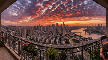 上海陆家嘴金融中心的航拍全景,标志性建筑包括东方明珠电视塔、上海环球金融中心和上海中心大厦,摩天大楼群在日落时分被温暖的橙粉色霞光与深蓝渐变的天空笼罩,云层呈现出丰富的层次感和流动感,黄浦江蜿蜒穿过城市,水面倒映着建筑的璀璨灯光和天空的绚丽色彩,城市灯光已部分亮起,形成温暖的金色与冷调的蓝色交织的光影效果,整体呈现出现代、繁华且极具视觉冲击力的都市夜景氛围,采用写实主义摄影风格,高清晰度,广角视野,色彩饱满,光影对比强烈,强调城市天际线的宏伟与江水的灵动。