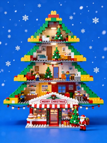 乐高圣诞树楼房剖面,底层是温馨甜品店,上层为节日家居场景,圣诞装饰点缀其中。建筑轮廓逐层收拢如圣诞树,在雪花背景下透出童趣与温馨节日氛围。