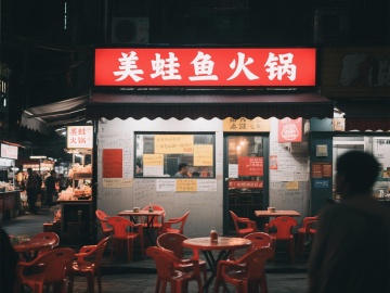 赛博朋克风霓虹灯招牌,未来感十足,夜景中闪烁着科技与美食的光芒。