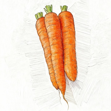 一束新鲜饱满的橙色胡萝卜,带着翠绿挺拔的缨叶,表面覆盖着晶莹剔透的水珠,水珠大小不一、分布自然,凸显出刚洗净的水润质感。胡萝卜表皮光滑且带有自然生长的细密纹理和纵向沟壑,色彩从根部的深橙逐渐过渡到顶部的浅橙,顶部的绿色缨叶带有细小锯齿状边缘,叶片舒展且富有生机。整体采用近景特写构图,背景为纯黑色,形成强烈的色彩对比,突出胡萝卜的鲜艳色泽和细节质感,光线从斜上方照射,在胡萝卜表面形成明亮的高光和柔和的阴影,营造出清新、新鲜、充满活力的氛围,变换细节体现在部分胡萝卜的弯曲弧度略有不同,水珠的分布位置和大小呈现自然随机的细微差异。
