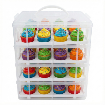 这是多层纸杯蛋糕打包盒手提甜品收纳盒 白色x四层x含48孔杯架 生成三张1600*1600的场景图 里面添加纸杯蛋糕 场景为生日派对