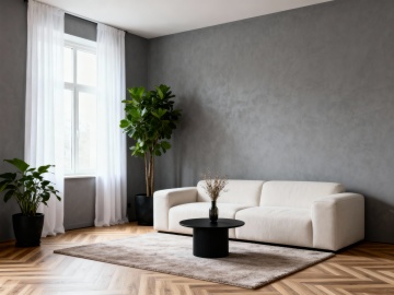极简主义风格的现代客厅背景,整体以米白色、原木色和浅灰色为主色调,柔和的自然光从左侧大窗户斜射入室内,在墙面和地板上形成清晰而温暖的光影效果,光线明亮且均匀,营造出宁静、舒适、通透的氛围。画面中央是一张米白色布艺三人沙发,搭配同色系的靠垫,沙发腿部为浅色木质,沙发上随意搭着一条浅色毯子。沙发前方是一张浅木色长方形茶几,茶几上摆放着简约的白色陶瓷花瓶和几本书籍。沙发左侧靠近窗户处有一盆茂盛的绿色植物,栽种在白色高花盆中。沙发右侧是一个浅色木质书架,书架上摆放着少量书籍、装饰品和一个装饰画框。地面铺设浅色木地板,沙发前铺有一块浅灰色地毯。整个场景构图简洁大方,线条流畅,材质表现细腻(布艺的柔软、木质的温润、陶瓷的光滑),空间感强,具有高度的现代设计感和舒适的居家氛围。