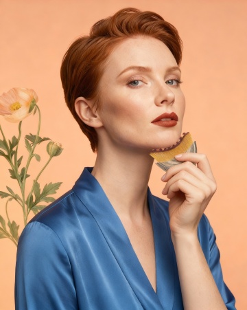 用图中的梳子做一个欧洲模特使用中的场景,模特在化妆台前梳理头发,画面整洁