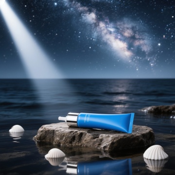 超写实电商产品图,被形态各异的透明水珠、水簇环绕,部分水珠附着产品表面。背景为低饱和渐变底色,冷调光源从侧下方照射,凸显产品科技感与成分专业性。材质表现哑光细腻,色彩搭配以主体色彩为主,色调柔和高级,构图采用轻微倾斜角度,动态元素环绕主体,含品牌 logo