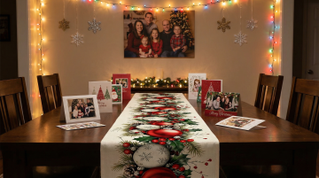 以图中的7 件套圣诞餐垫套装元素,物体主体特征不变,设计6张跟7 件套圣诞餐垫套装有关的图,比例 16:9