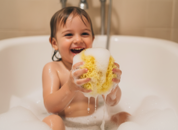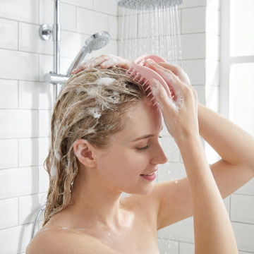一个欧美的年轻女性正拿着图中的造型梳子(洗头梳)在浴室洗头,梳子特写(突出梳子)