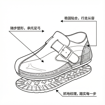 【结构 · 舒适的哲学】 视觉: 45度角产品爆炸图或线稿解析图,标注关键部位。 文案: 为舒适而生的每一个细节 细节标注: 符合足弓的鞋床: 均匀承托,久走不累。 加厚缓震鞋底: 柔韧回弹,步履轻快。 包容性鞋头: 给予脚趾自由舒展的空间。 可调节搭扣: 适应不同的脚背高度。