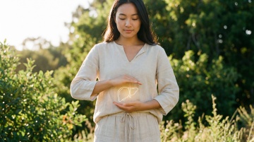 清新自然的实景画面,融合轻拟物风与白描线条,展现女性温柔守护肝部轮廓,传递健康呼吸的舒适感与简约主义美学。