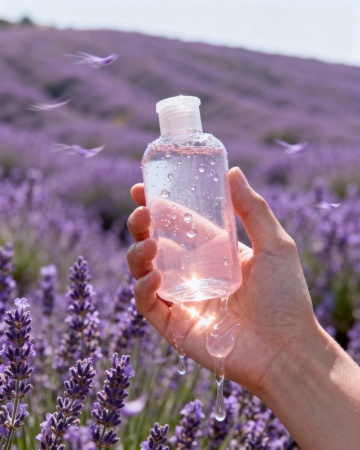 一个透明玻璃材质的棕色精油瓶,配有深色木质瓶盖,瓶身简约无过多装饰,放置在铺满干燥薰衣草花穗的浅色石台上,周围散落着几片完整的薰衣草叶片和几颗饱满的薰衣草花苞,背景是柔和虚化的淡紫色薰衣草花田,清晨的阳光透过薄雾洒下,在瓶身和花穗上形成细腻的光斑和柔和的阴影,水面倒映着瓶身和花穗的轮廓,整体画面呈现出宁静自然的氛围,光影柔和,色彩以紫色和淡绿色为主,质感细腻,细节清晰。