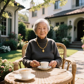 一对头发花白的老年夫妇在不同的户外场景中温馨互动的画面,背景可以是公园的林荫道、湖边的长椅、山间的小径或宁静的花园等。两位老人面带温暖灿烂的笑容,神情愉悦自然,老爷爷穿着浅灰色的长袖针织衫,老奶奶穿着米色的高领内搭和同色系的开衫马甲,老奶奶手中捧着一个白色的茶杯,老爷爷的手臂亲切地搭在老奶奶的肩上,两人姿态亲密和谐。画面整体采用写实风格,光线明亮柔和,以自然光为主,呈现出温暖的色调,绿色的植物背景郁郁葱葱,充满生机,营造出宁静、幸福、安逸的氛围,整体构图清晰,主体突出,细节丰富,具有生活气息和情感温度。