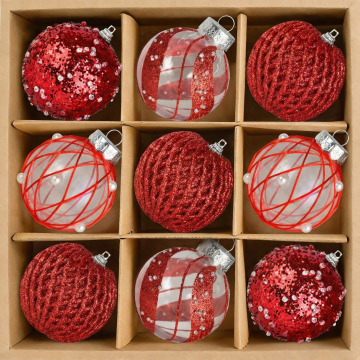 一个堆叠的礼品盒组合,包含四个主要礼盒和几个金色装饰球。最大的礼盒是红色的,带有金色缎带和蝴蝶结,位于堆叠的后方中央。其右侧是一个米黄色礼盒,配有红色缎带和较大的蝴蝶结。前方左侧是一个米黄色礼盒,带有红色缎带和蝴蝶结。前方中央是一个倾斜的红色礼盒,带有金色缎带和蝴蝶结。右侧前方是一个较小的红色礼盒,带有金色缎带。几个金色的圆形装饰球散落在礼盒周围,增添节日气氛。整体构图饱满,礼盒之间有前后层次,色彩以红色和金色为主,营造出喜庆、欢快的氛围。