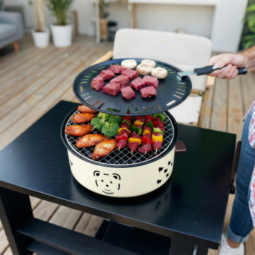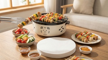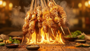 写实风格美食摄影,特写镜头下一位穿着白色围裙的厨师正在户外露营环境中烧烤,左手握着几串滋滋冒油的烤肉串正从炭火上拿起,右手也持着烤串,烧烤架上摆满了各种烤肉和烤蔬菜,火焰熊熊燃烧,升腾起袅袅青烟,肉质呈现出诱人的焦香色泽和清晰纹理,周围是自然的露营场景,有帐篷、树木和户外桌椅,整体色调温暖,光影对比强烈,突出食物的质感和烧烤的烟火气,营造出户外露营烧烤的热闹、惬意氛围。