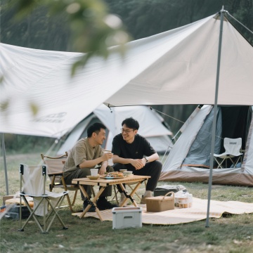 傍晚户外露营场景,白色帐篷下人们围坐在餐桌旁聚餐,帐篷顶部和四周悬挂着温暖的串灯,周围点缀着点燃的蜡烛和灯笼,营造出温馨浪漫的氛围,绿色草坪上散落着舒适的坐垫和靠枕,树木的枝叶在灯光下形成柔和的阴影,整体色调温暖,光影层次丰富,充满自然惬意的露营生活气息。