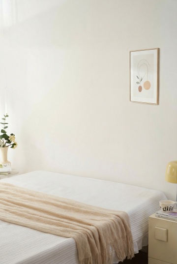 极简主义风格卧室,柔和的自然光从侧面窗户洒入,在米白色墙面上形成柔和的光影条纹,浅色木地板干净整洁,中央是铺着白色棉质床单和灰色条纹毯子的双人床,床头搭配浅灰色软包床头板,旁边是原木色小圆床头柜,上面放置透明玻璃瓶和小玻璃杯,床头柜旁有一盆绿色植物,整体氛围宁静、舒适、简约,不同角度展示卧室的布局和设置,保持相同的色调、光影和材质质感。