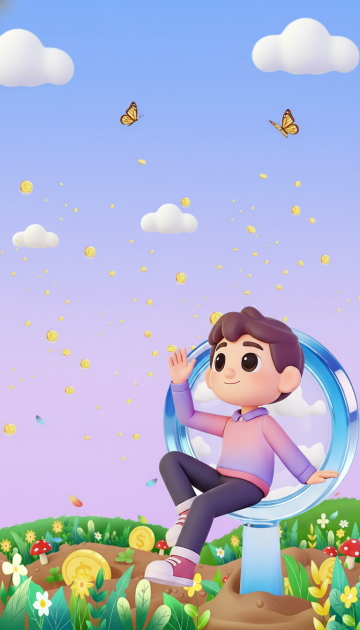 请根据这张图现有元素,完善画面内容,使画面内容不在单调,要保证画风一致,颜色互相搭配(包括人物的一衣服、鞋子,储钱罐,和折线图),把整体效果改要3d渲染,不要金属元素,画面上边不要添加内容