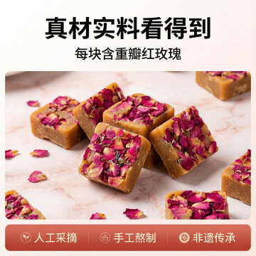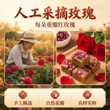 这张图片是产品主体这款产品是云南古法玫瑰红糖 我需要设计20张主图在拼多多上面售卖 主图场景 多增加一些玫瑰红糖水的设计 色调偏微红一些 要求高级 主图文案内容 玫瑰暖养 红润好容颜 古法手作 百年非遗 真材实料 重瓣红玫瑰 方便携带 天而不捏 味道醇厚 口感温润 口口甘蔗清香 原汁红糖 古法工艺 手工熬制红糖 好吃不上火 72 小时慢火熬制 无高温浓缩 保留红糖原香与玫瑰活性成分 精选云南高山甘蔗 人工采摘玫瑰 手工搅拌挂霜 每块都带自然玫瑰花瓣 暖腹驱寒 缓解痛经 告别手脚冰凉 补气血 改善气色