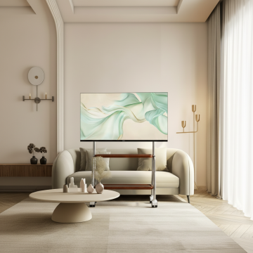 一台现代超薄液晶电视,屏幕上显示着高清写实风格的雪山风景,画面中巍峨的雪山峰顶覆盖着洁白的积雪,山体呈现出灰黑色的岩石纹理,山脚下是金黄色的植被和蜿蜒的河流,河流中点缀着大小不一的黑色岩石,天空是清澈的淡蓝色,整体色彩鲜明,光影层次丰富,电视的银色金属支架支撑着屏幕,展现出简约而现代的设计感。