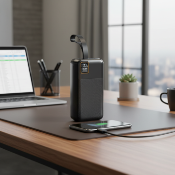 一个现代风格的展台,展台主体为流畅的波浪形结构,整体采用深蓝色与亮橙色的渐变配色,展台顶部有一个白色的手持小风扇,风扇底座为黑色,带有金色的按钮和指示灯,展台放置在光滑的深灰色地面上,背景为渐变的深蓝色,顶部有柔和的白色灯光照射下来,营造出科技感与时尚感兼具的氛围