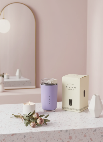 现代简约风加湿器,3D渲染质感,玻璃桌面倒影清晰,蓝紫渐变光影营造未来科技感与清透柔和氛围,轻拟物设计突显舒适生活美学。