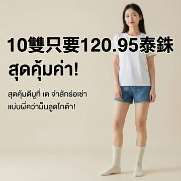 这是我在TIKTOK小店正在卖的女士长筒袜,售卖国家是泰国,主要人群是年轻女士,主要卖点是价格实惠,款式多样,细节到位,吸汗透气,轻薄,防臭,10双装才买120.95泰铢令吉,现在我希望出1张电商首图吸引消费者点进链接,可以体现,虽然小贵,但是真的非常好的语言,促进销售,要求:买点展示清晰,细节展示到位,有运动场景展示,有袜子穿上的效果展示,文案用泰文,符合泰国民众的阅读习惯,如果你是一名资深的tk跨境电商美工,你会怎么设计这些图片