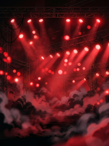 舞台设计,具有未来感和科技感的音乐表演舞台,舞台中央有黑色麦克风支架和麦克风,舞台地面由紫色发光方块地砖铺成,反射出明亮光泽,舞台背景是带有网格图案的深紫色墙面,两侧矗立着巨大的白色音响设备,音响上有圆形扬声器图案,舞台后方有蓝色透光玻璃窗,窗内隐约可见三个人影剪影,整体空间采用紫色和蓝色为主色调,搭配深色网格元素,灯光从上方投射出聚焦光束,营造出夜晚音乐演出的动感与神秘氛围,具有动漫风格的光影效果和清晰的线条轮廓,舞台两侧有对称的灯光装置,地面反光强烈,整体设计呈现出时尚、现代的视觉美感。
