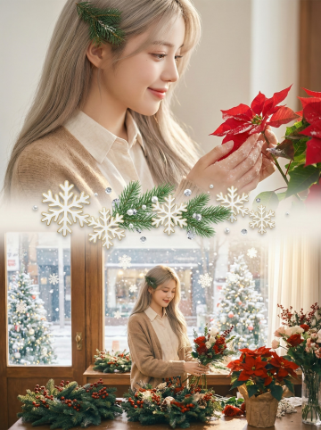 白色圣诞雪花与焦糖色毛绒丝带交织,雪花边缘鎏金描边,间隙穿插绿色松枝与红色浆果,点缀迷你焦糖色圣诞袜,飘着细碎的金棕色亮片,营造质朴温暖的圣诞氛围。