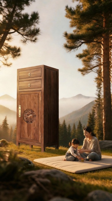 一张中式古典风格的实木长桌特写,桌面呈现温润的浅棕色木纹,边缘为深棕色雕花实木边框,桌腿带有精致的传统中式镂空雕刻纹样。背景是一幅模糊的古画,整体画面采用暖色调光线,光线从斜上方照射在桌面上,形成柔和的光影过渡,营造出宁静、典雅、富有文化底蕴的氛围。画面聚焦于桌子的质感和细节,木纹清晰可见,雕花精致细腻,整体构图采用近景特写,突出实木家具的自然纹理与工艺美感,具有浓厚的东方传统韵味和古朴雅致的设计感。
