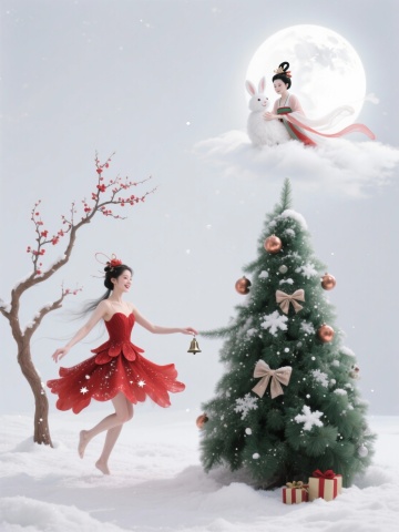 梦幻水彩风融合国潮元素,红裙舞者与嫦娥共舞雪境,圣诞树与梅花点缀,超现实粒子光影交织,呈现中西合璧的浪漫喜庆。