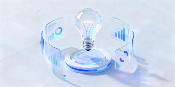 未来感与科技感交织的3D风插画,采用清透玻璃质感与轻拟物设计,展现数据流动与智能互联,几何结构突出体积感,蓝色调传递高效与现代。