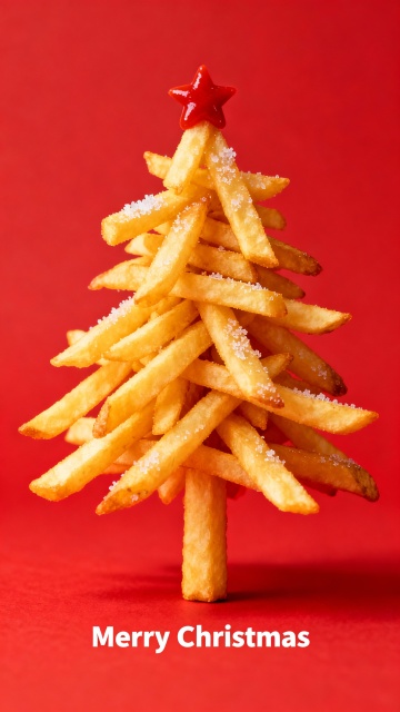 薯条堆叠成圣诞树,鎏金星顶点缀彩灯,微缩艺术风融合波普色彩,金属质感与重拟物设计交织,喜庆趣味感十足。