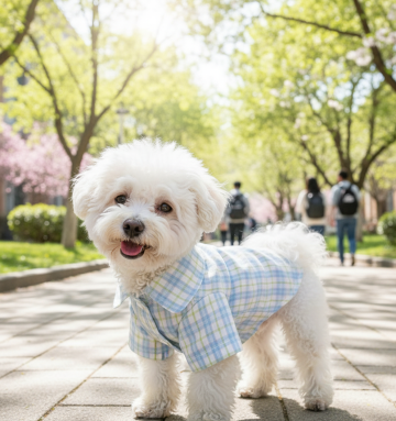 比熊穿上图中的照片,在草坪中玩耍,回眸一望,突出动态与户外感