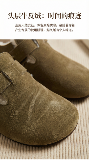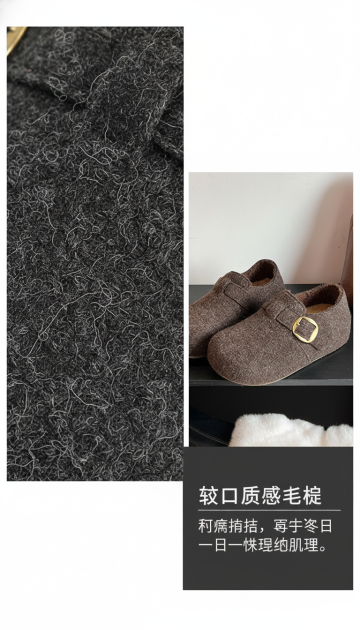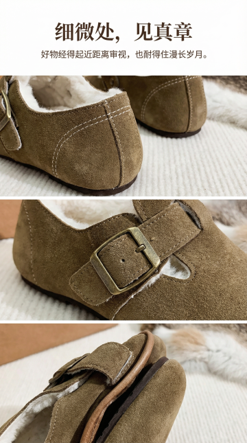 细节与护理 - 长久的陪伴 视觉: 平铺细节组图。 毛呢与皮革拼接处的精细车线。 鞋底防滑纹路的特写。 附赠的毛呢护理刷轻轻刷过鞋面的场景。 文案: 精致,在于可见与不可见之处。附上简约的毛呢鞋护理小贴士。