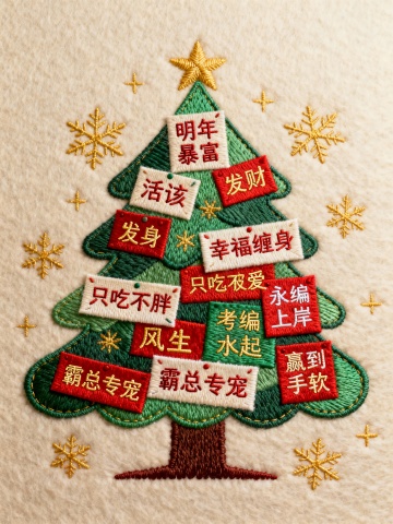 精美的扬州刺绣风格的便签大小不一,缝制而成的圣诞树(便签上写着祝福语:明年暴富、活该发财、幸福缠身、只吃不胖、永远被爱、考编上岸、风生水起、霸总专宠等),色彩明快,颜色丰富,主题颜色是红绿配色,米色毛毡背景,背景上有金黄色刺绣雪花点缀,暖色光照在圣诞树上,便签上的祝福语在暖色光的照射下熠熠生辉。
