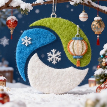 毛发生长风与拼贴风融合,3D质感的毛毡月亮挂饰,点缀雪花与灯笼,营造温馨梦幻的冬日节日氛围。