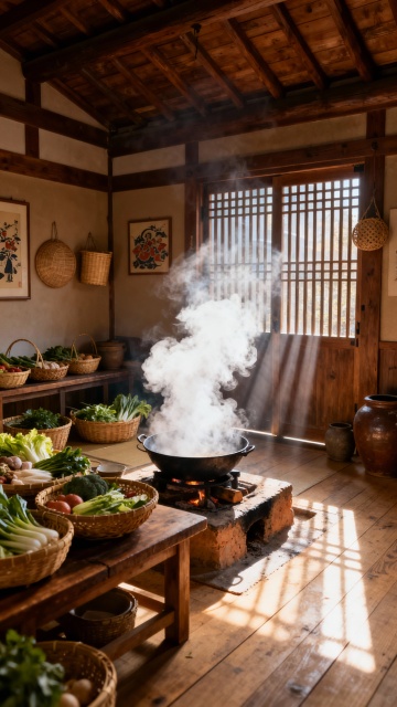 中国传统庭院,午后阳光透过茂密竹叶洒落斑驳光影,古朴竹编遮阳伞下,摆放着圆形木质矮桌和藤编灯笼,旁边配简约木椅,背景是白墙灰瓦的中式建筑和形态自然的假山石,地面铺着细小鹅卵石,整体呈现静谧禅意的东方美学氛围,色调以青灰、原木色和竹绿色为主,光影柔和,构图采用前景竹叶局部遮挡营造层次感,画面传递出悠然闲适的庭院生活意境。