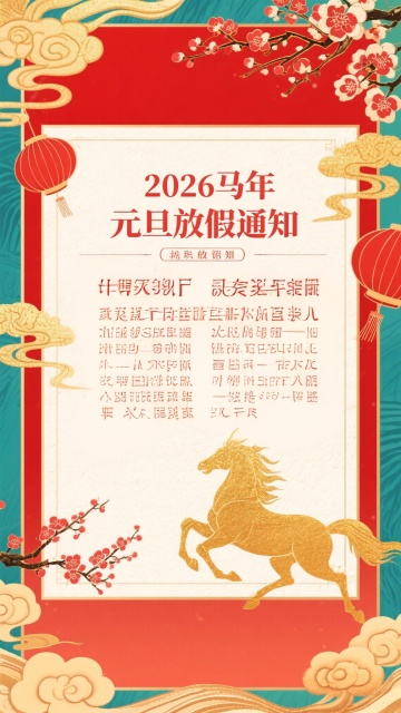 设计一张海报,主体颜色是红色和bulingbuling金黄色,正上方金黄色大大的“元旦快乐”文案,背景有灯笼烟花和不规则的闪金色底纹,一个马生肖的插画放在图的右下方,“2026”文案放图下中的位置,整体海报呈现新年气派,画面整体看着协调流畅