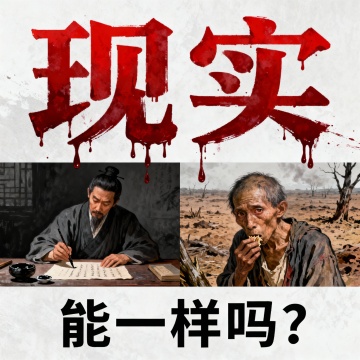 水墨风与厚涂风交融,工笔细节刻画文人书写与饥民啃食,拼贴式构图呈现古典感与沉郁感,大字“现实”血滴淋漓,超现实主义质问命运不公。