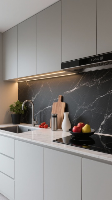 极简主义风格厨房室内设计,整体采用现代简约美学,以黑白灰为主色调,搭配深灰色大理石纹理台面和黑色大理石纹背景墙,上部为浅灰色哑光橱柜,下部为白色哑光柜门,台面中央嵌入式黑色电磁炉,台面上左侧放置一个黑色圆形果盘,内有红黄相间的苹果和梨,背景墙下方台面上从左至右依次摆放着不锈钢水槽、黑色花盆中的绿色植物、红色小番茄、不锈钢保温杯、木质砧板和白色陶瓷花瓶,顶部橱柜下方有长条状暖黄色LED灯带提供柔和照明,光线在大理石表面形成细腻的光影反射,营造出干净、整洁、高级的空间氛围,无任何文字、LOGO及二维码元素。