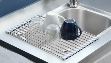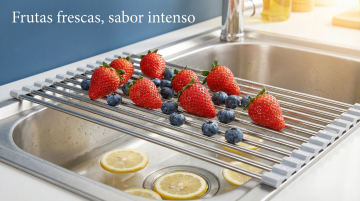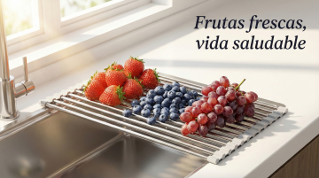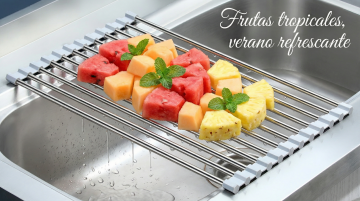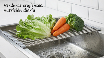 以图中的不锈钢沥水架为元素,适用于食物、水果和蔬菜,物体主体特征不变,设计6张跟不锈钢沥水架有关的图,可以适当加一些西班牙语的文案点缀一下,比例 16:9