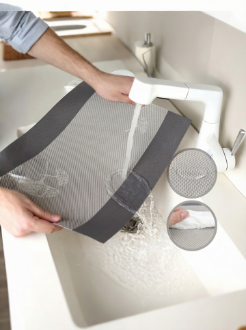 超写实3D渲染的现代厨房水龙头特写,极简主义设计风格,银色金属质感水龙头搭配可旋转出水口,安装在白色光滑人造石台面上,嵌入式不锈钢水槽带有圆形排水口,下方为深灰色哑光橱柜配银色长条形拉手,背景是浅色木质地板,柔和自然光从上方照射形成细腻高光与阴影,整体呈现干净、高级、宁静的氛围,注重材质纹理细节与空间层次感,不同角度展示水龙头在现代厨房环境中的多种布局搭配。
