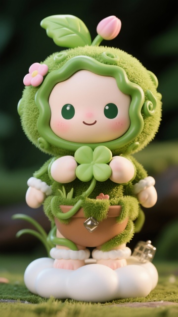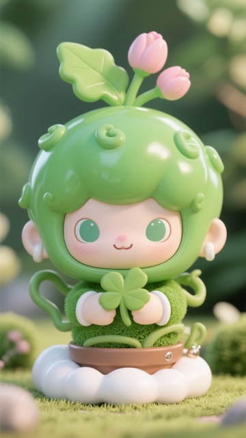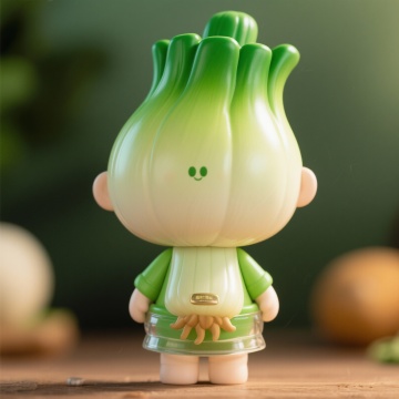 生成一个乡村振兴科技感Q版蘑菇IP形象,菌盖为透明渐变材质,手持谷物,色彩明亮温暖治愈适合手办文创周边。