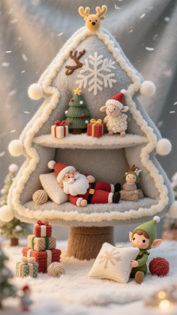 柔软毛线编织的梦幻圣诞树,融合3D微缩艺术与卡通风格,暖光点缀,童趣盎然,营造温馨可爱的节日氛围。