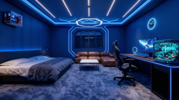 俯视角构图,在深邃午夜蓝与墨黑交织的极简主义客厅中,月光从右侧整面落地窗倾泻而入,在深灰色微水泥地面上切割出几何形状的冷冽光斑。中央是一组悬浮式深炭灰布艺转角沙发,搭配三个珊瑚橙绒面靠垫和一个黄铜边几,茶几由烟熏玻璃台面与黑色金属支架构成,上面静置着一株小型琴叶榕与黄铜几何烛台。沙发背景墙采用3D立体波浪纹理设计,悬挂着一幅无框抽象霓虹灯管装置艺术,发出幽蓝与玫瑰金的渐变光芒。右侧角落矗立着一株三层式龟背竹,种植在带有蚀刻纹理的哑光黑陶瓷花盆中。天花板嵌入磁吸轨道灯系统,投射出精准的洗墙光束,墙角暗藏的LED灯带勾勒出空间轮廓,整体氛围呈现出冷静克制的未来感与细腻的材质碰撞。