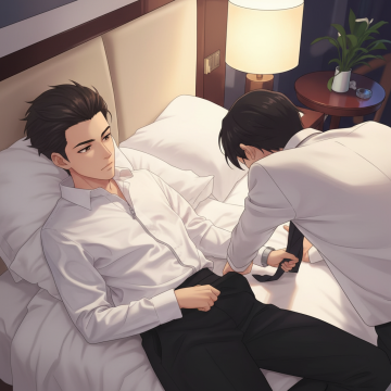 第一张图右边的猩猩角色和男角色两人正靠在一起鬼鬼祟祟的讨论着什么,背对着我们,左边的女角色路过此处并站着看向他俩,表情错愕,女角色同样也是背对着我们,女角色在前景,只看到半身背面,另外两个角色在中景,整体画面构图可参考第二张图那样,二次元风格,女角色的形象参考第三张图