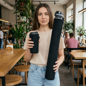 一个外国美女在炎热的太阳底下一只手擦头上的汗,一只手拿着粉色保温瓶,将图片二中的黑色保温套,套到美女手中的粉色保温瓶,远景,人物穿着灰粉色无袖运动夏季套装