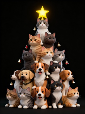 jellycat风格。全景构图。圣诞树由各种品种的猫和狗组成。顶部是一个铃铛。每只猫狗各有差异,有的戴着圣诞风的围脖,有的戴着圣诞帽子,有的穿着圣诞礼服。周围摆着很多礼物盒子。背景是温馨的家里,壁炉烧着火。